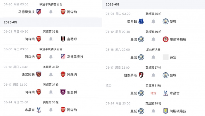 阿森纳&曼城英超收官前赛程: